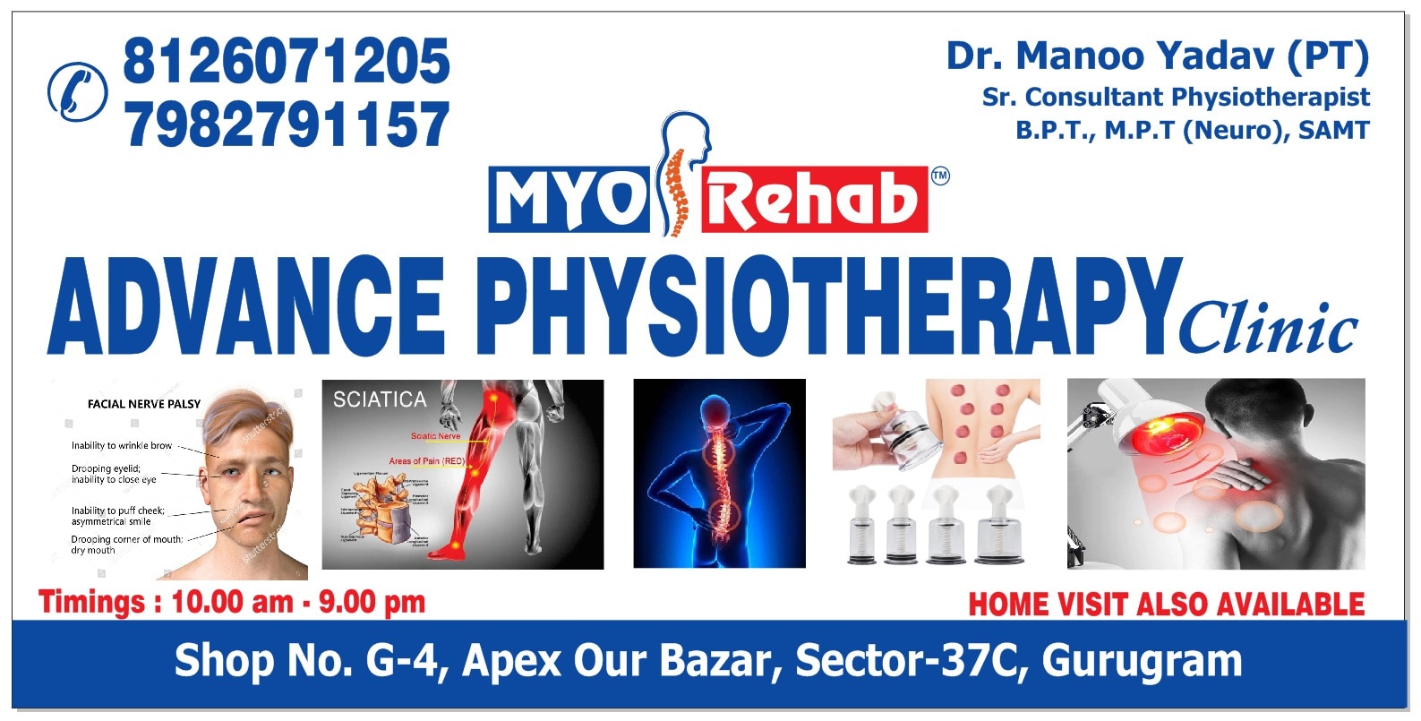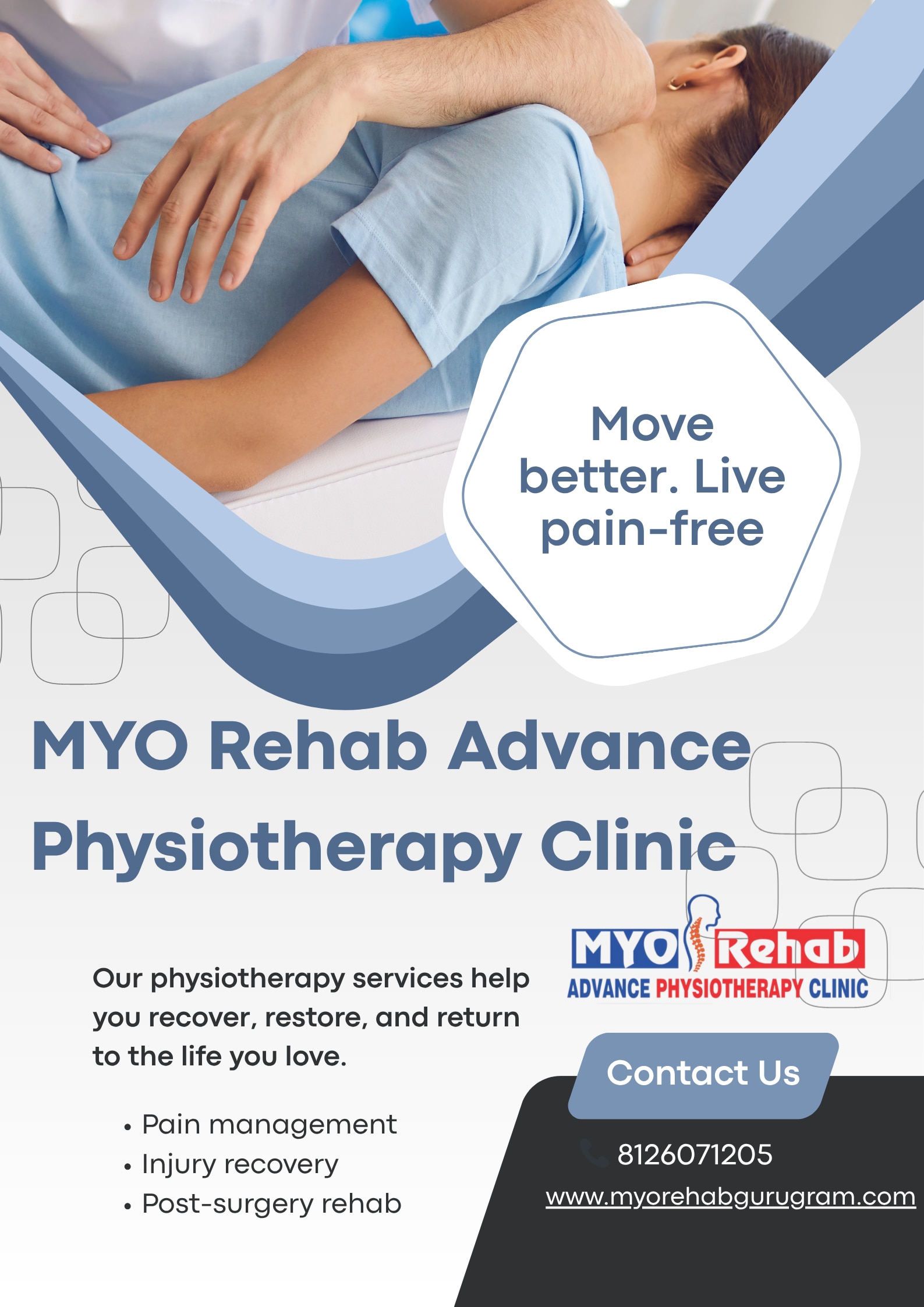 MYO Rehab Advance Physiotherapy Clinic is one of the best physiotherapy clinics in Gurugram. Our main focus is on providing best and effective physiotherapy treatments for musculoskeletal problems as well as sports and general injuries. Clinic has modern equipment for physiotherapy like TENS, IFT, Ultrasonic, Laser Therapy, IRR Therapy, Muscle Stimulator, Lumbar & Cervical Traction, etc. If you are looking for best physiotherapy services in Gurugram then you contact MYO Rehab. We offer free consultation during which we will discuss your pain issues and ask you about your previous medical treatment, your symptoms, and suggest you the best therapy for faster recovery.